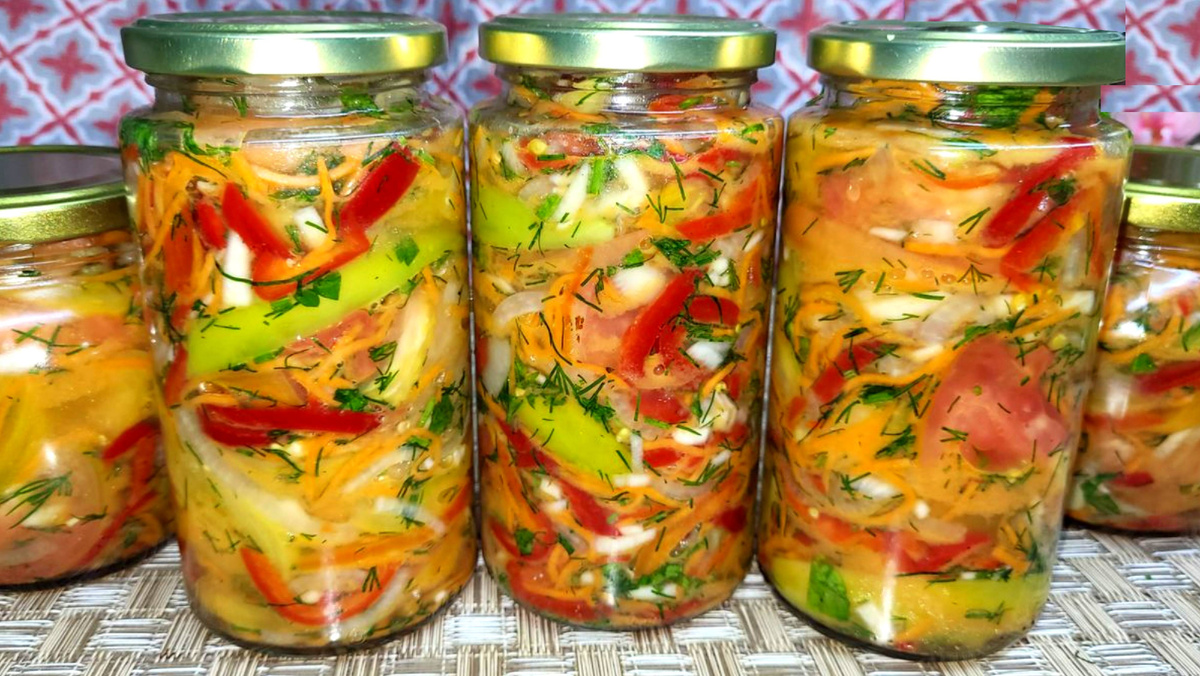 Банки заполняются овощами с выделившимся соком, крышки закрываются, а затем банки проходят теплообработку в духовке. После охлаждения они уходят в прохладное место, где сохраняют яркость и характер салата.