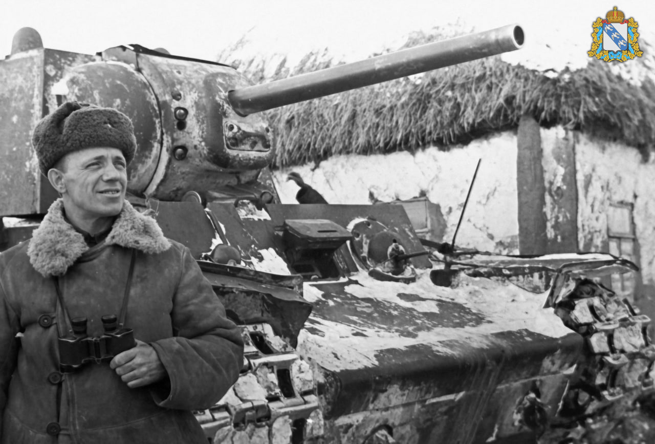 28 января 1943 года районный центр был освобождён. На фото командир 180-й танковой бригады полковник Михаил Захарович Киселев у танка КВ-1 в Касторном. #память