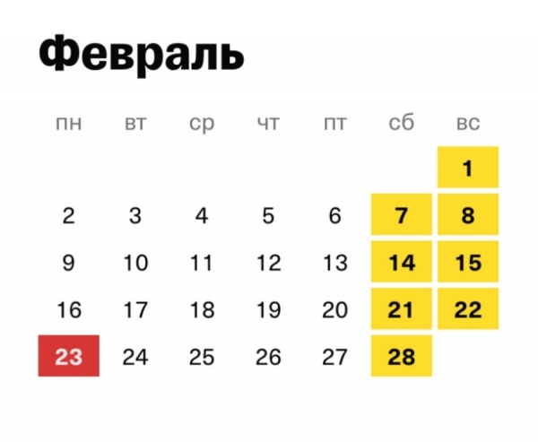 Выходные продлятся с 21 по 23 февраля — в связи с Днем защитника Отечества. Таким образом в конце месяца россияне будут работать с 25 по 27 февраля. Всего в феврале 19 рабочих и 9 нерабочих дней.