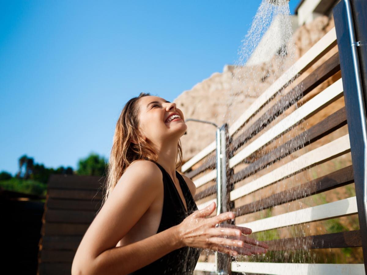 - Душ с солнечным подогревом — это бесплатное решение, но оно эффективно только в солнечные дни.