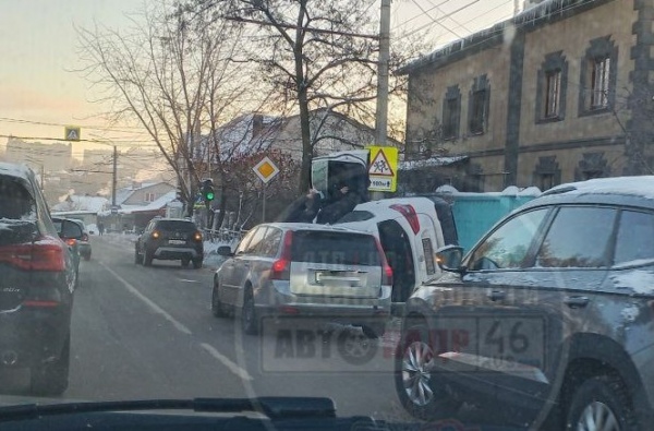 Серьезное ДТП произошло в Курске утром 4 февраля. Один из автомобилей опрокинулся на бок.