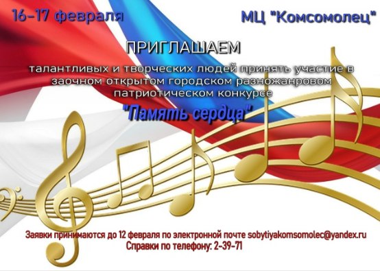 Молодежный центр «Комсомолец» приглашает Вас принять участие в открытом городском патриотическом разножанровом конкурсе «Память сердца» в заочном формате