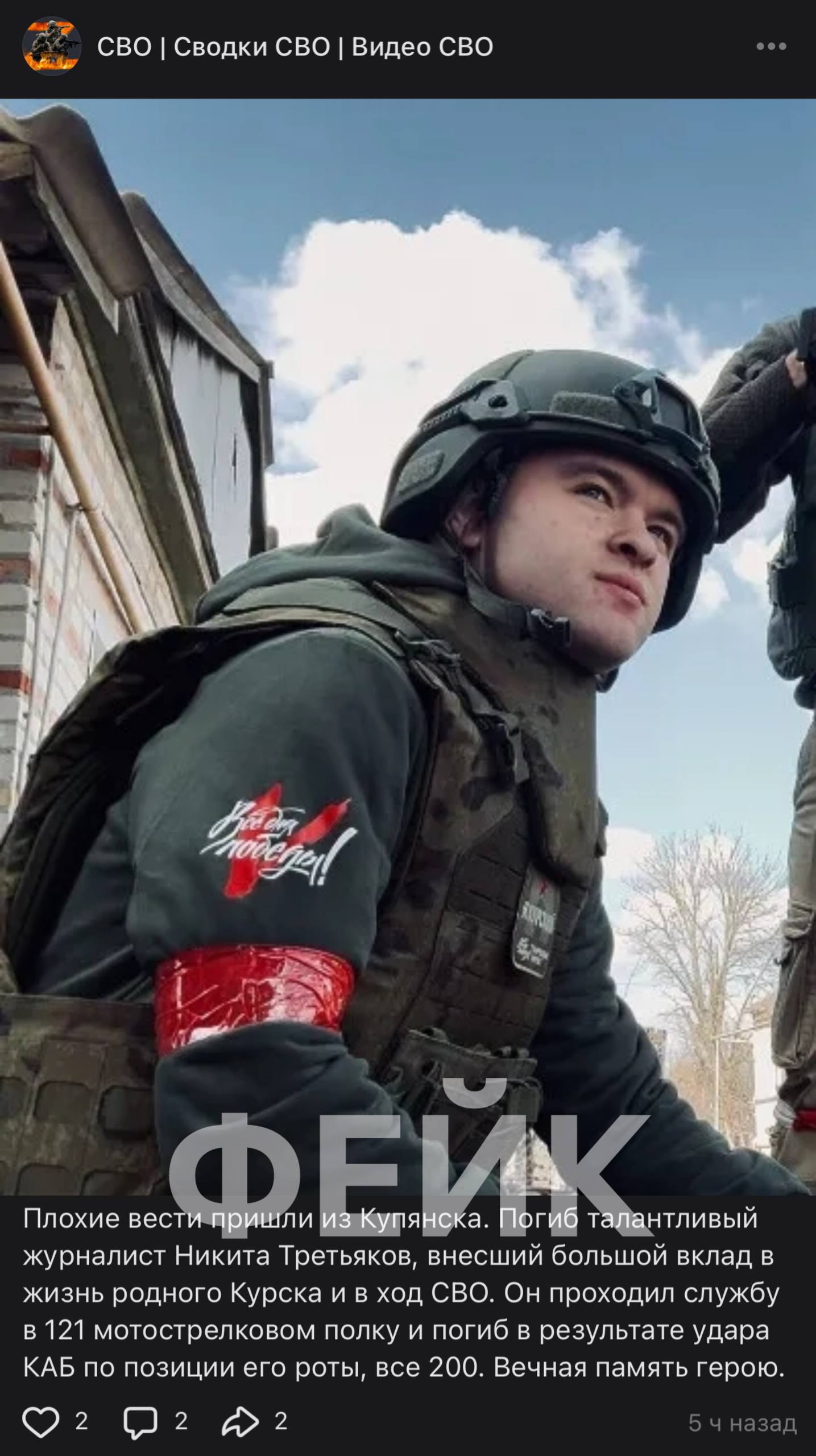 Враги распространяют фейк о гибели на фронте автора «Актуального Курска» Никиты Третьякова. В сети уже появились десятки лживых публикаций на эту тему.