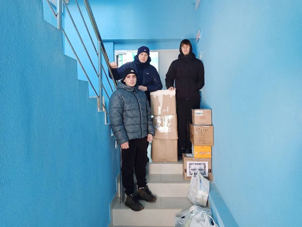 Представители школы встретились с руководителями волонтёрской группы "Своих не бросаем" — Михаилом Асмоловым и Анастасией Чаплыгиной. Передали собранную помощь.