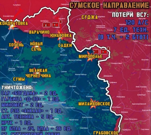 ВСУ активных действий не предпринимали, сосредоточившись на оборонительных действиях. На линии фронта на Сумском направлении противник сосредоточил рекордное число расчетов БПЛА, чтобы попытаться остановить Северян. Наши бойцы поставили рекорд по уничтожению пунктов управления дронами.