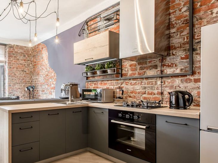 Горячий воздух идет вверх. Шкафы нагреваются, краска трескается, дерево деформируется. Расстояние до полок — минимум 40 см. Иначе ремонт кухни влетит в копейку.