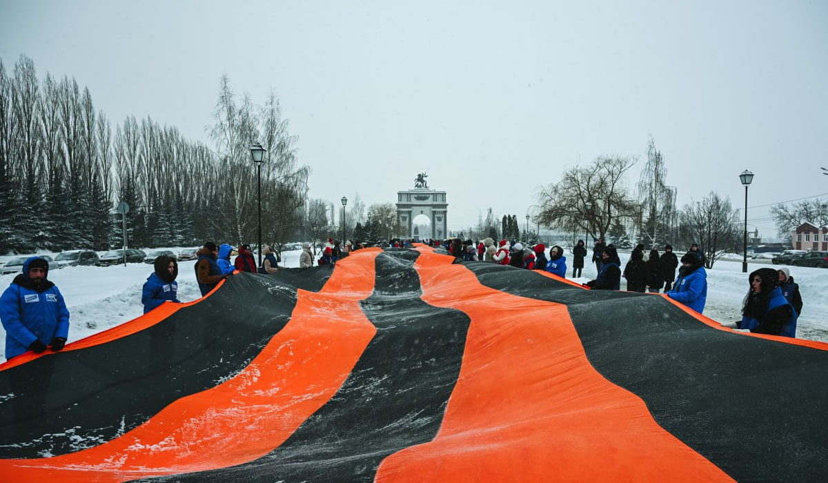 Более 200 волонтёров, юнармейцев, ребят из «Движения Первых» выстроились вдоль подъездной аллеи к мемориалу и расправили 150-метровое полотнище георгиевской ленты — символа воинской славы и памяти о Великой Отечественной войне. В мероприятии принял участие и.о. губернатора Александр Чепик.