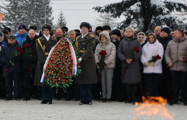На мемориале "Курская дуга" на проспекте Победы прошел памятный митинг, возложили цветы и венки к могиле Неизвестного солдата, в которой захоронены останки 46 воинов.