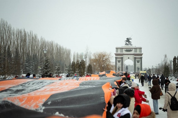 - Молодогвардейцы, юнармейцы, ребята из «Движение первых» и «Волонтерской Роты Боевого Братства» развернули 150-метровую георгиевскую ленту, — сообщил он.