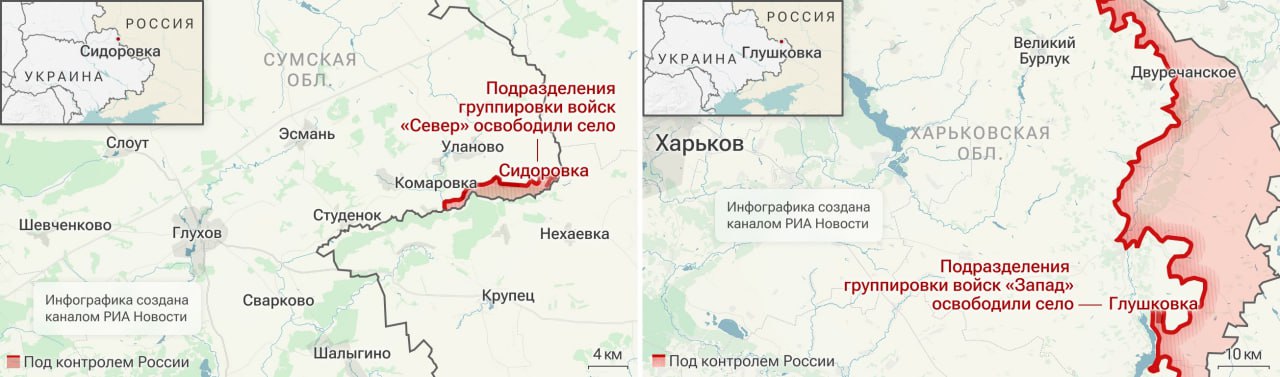 Армия России установила контроль над Глушковкой в Харьковской области и Сидоровкой в Сумской области, сообщило Минобороны.