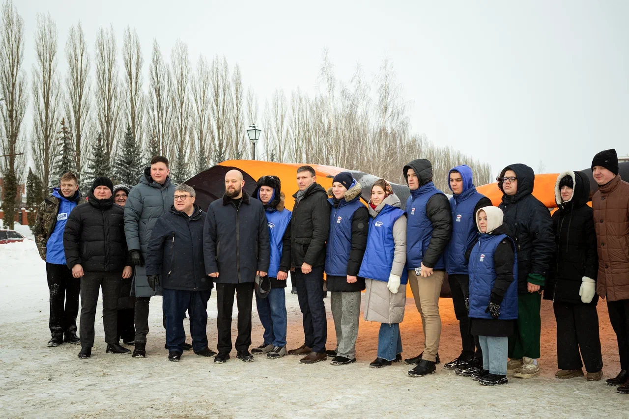 Более 200 волонтёров, юнармейцев, ребят из «Движения Первых» выстроились вдоль подъездной аллеи к мемориалу и расправили 150-метровое полотнище...