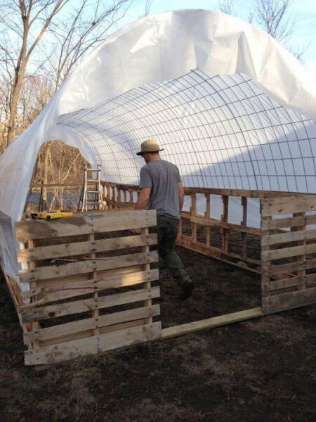 - Тоннель с открытыми торцами. Эта конструкция не совсем теплица, а скорее тоннель, который помогает создать комфортный микроклимат для растений, защищая их от ветра и дождя в большинстве случаев. Проще всего сделать низ из паллет и каркас из строительной сетки, а сверху накрыть пленкой или агротканью.