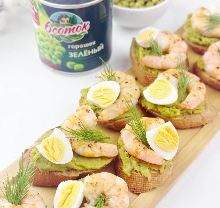 Иногда простая идея оказывается именно той, что спасает вечер: остатки праздничного столa превращаются в светлую, легкую закуску без лишних хлопот. Голод исчезает под тонким слоем крема из зеленого горошка на хрустящем хлебе, а на вершине — сочная креветка и яркая капля перепелиного яйца. Никаких сложностей, только гармония вкусов и скорость подготовки.