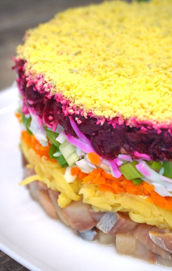 Далее идёт зелёный лук, и поверх — яйца, часть желтков оставьте для украшения. Завершающий слой — свёкла, с аккуратной поверхностью и обильно смазанный майонезом. В конце — пожелтевшие желтки для акцента.