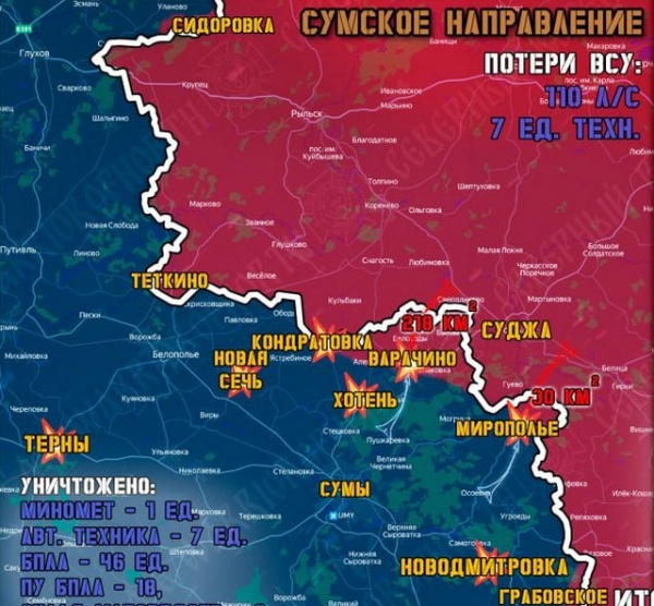 Северяне продвигаются на 17 участках фронта вглубь Сумской области в Глуховском, Краснопольском и Сумском районах по лесополосам, продавливая оборону ВСУ. Российская авиация и расчеты ударных БПЛА «Герань-2» точечно работали по выявленным целям.