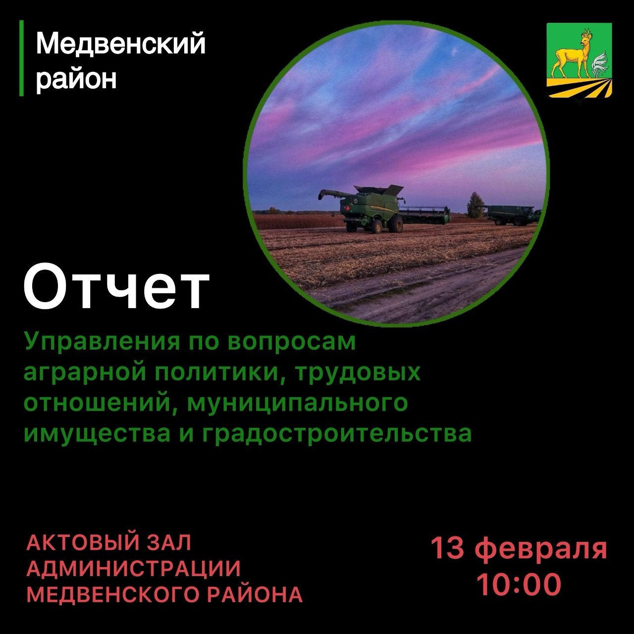 Уважаемые жители Медвенского района! 13 февраля в 10.00 ч. в актовом зале Администрации Медвенского района состоится Отчет Управления по вопросам аграрной политики, трудовых отношений, муниципального имущества и градостроительства Медвенского района.