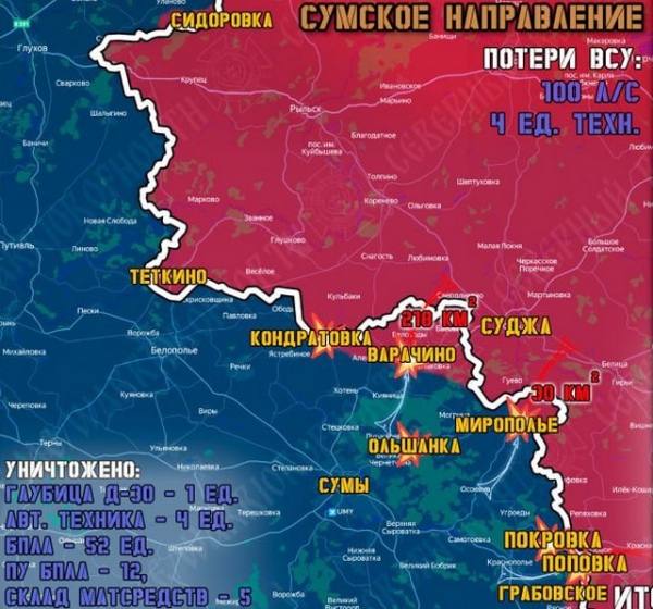Противник проводил перегруппировку, контратаковал и обстреливал ракетами гражданскую инфраструктуру приграничных районов. Из-за потерь и дефицита солдат на передовой командование ВСУ требует прислать под Сумы погранотряды, несущие дежурство на границе со странами Евросоюза.