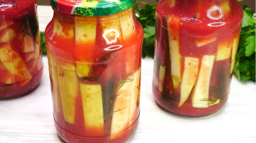 Для маринада потребуется 1 л перетертого томата, 1 ст. л. соли, 2 ст. л. сахара и 2 ст. л. уксуса. Кабачки очищаются, нарезаются и помещаются в подготовленные банки. Затем заливаются горячей томатной заливкой и закатываются.