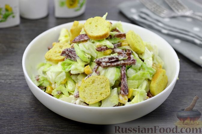 - Салат из молодой капусты с колбасой, кукурузой и сухариками. Сочетание свежести капусты с копченой колбасой, сладостью кукурузы и хрустом сухариков создает особую гармонию. Блинчики из яиц добавляют легкую нежность и придают салату воздушность.