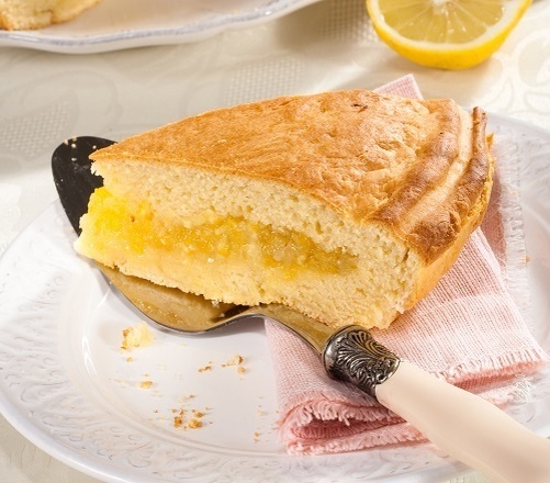 Далее разогрейте духовку до 220°C. Раскатайте каждую часть теста в пласты толщиной 1-1,5 см. Один из пластов положите на смазанный водой противень, распределите лимонную начинку, накройте вторым пластом, аккуратно защипните края. Не забудьте наколоть верх теста вилкой, чтобы пирог лучше пропекался. Выпекайте в духовке около 40 минут.