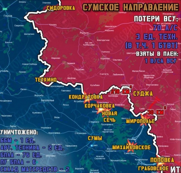 Штурмовые группы Северян продвинулись вглубь Сумской области на 14 участках в Глуховском, Краснопольском и Сумском районах, растягивая оборону ВСУ. К наступательным действиям подключаются российская авиация, артиллерия и «Солнцепеки».