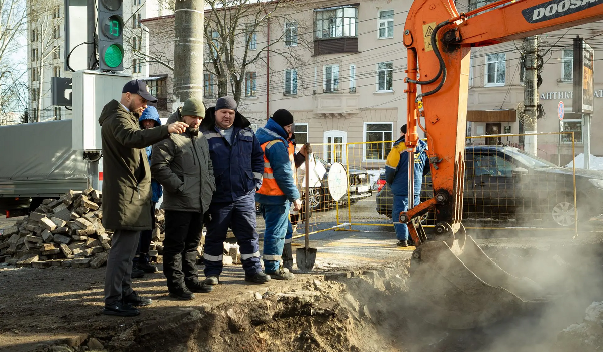 В Курске на улице Карла Либкнехта произошел порыв на участке теплосети. На место происшествия выехал мэр Евгений Маслов и пообщался с рабочими.