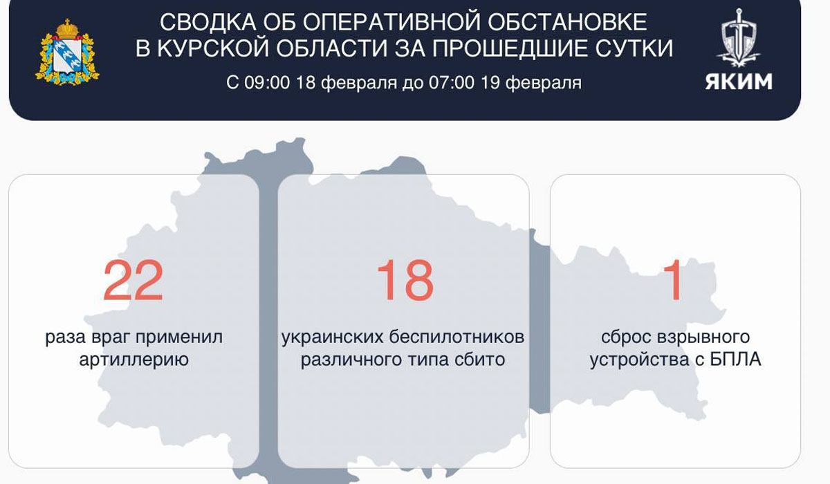 Всего в период с 09:00 18 февраля до 07:00 19 февраля 22 раза враг применил артиллерию по отселённым районам. 1 раз беспилотник атаковал регион с помощью сброса взрывчатки.