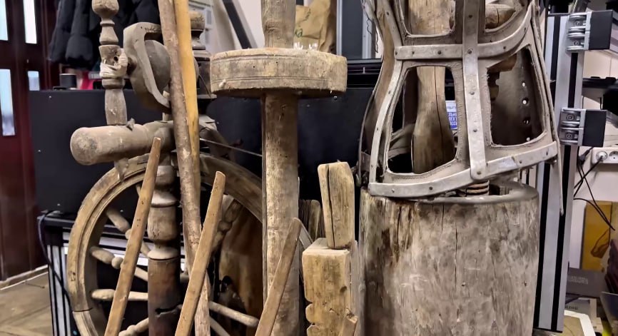 По его словам, коллекция была обнаружена в одном из домов. Среди найденных вещей — детали ткацкого станка, ступы, ухваты, утюги и фрагменты керамики. Эти предметы принадлежали народному мастеру России Александру Полякову. С согласия родственников коллекцию передали на временное хранение в Курский краеведческий музей.