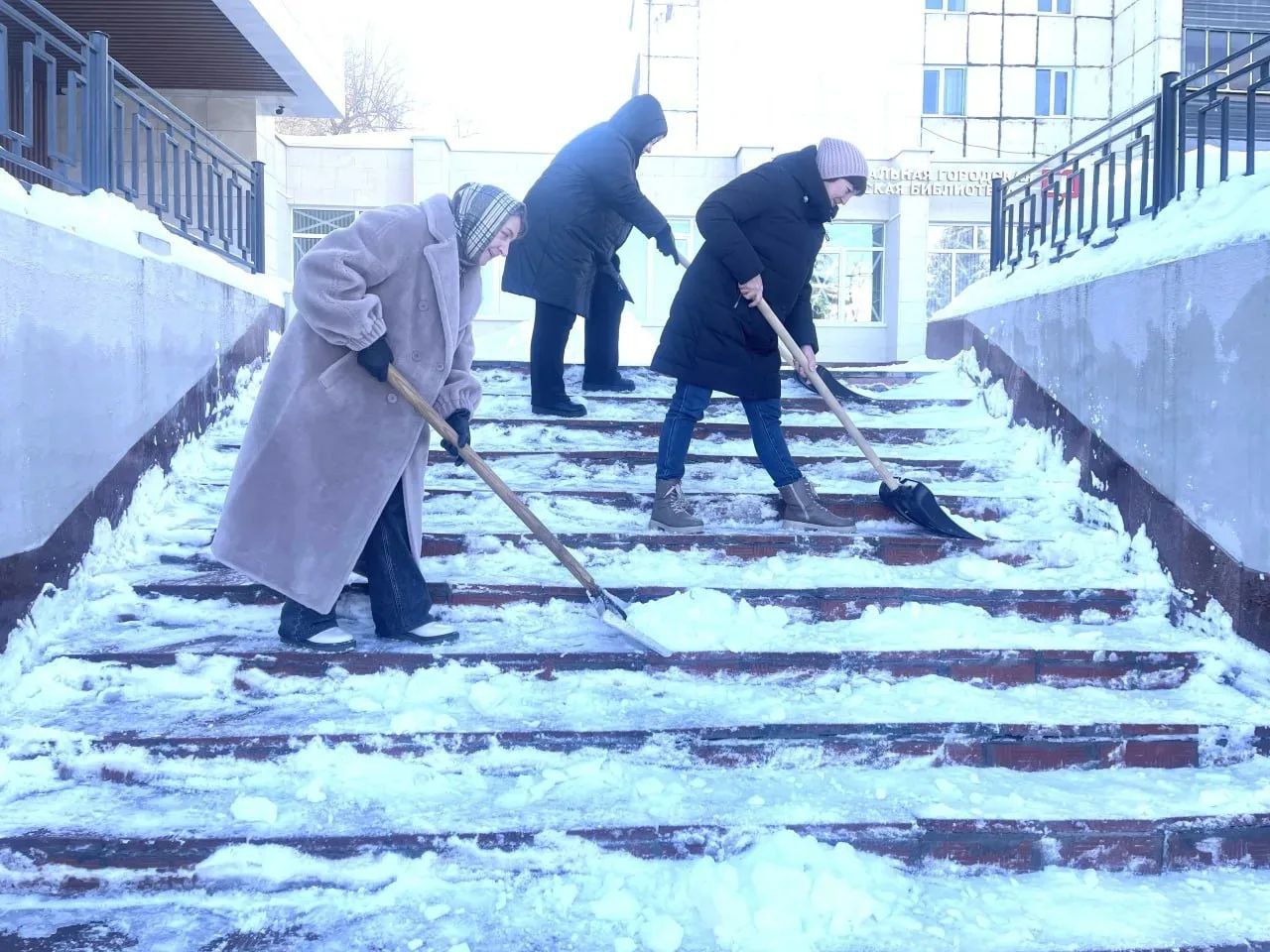 Они чистили остановки общественного транспорта, участки у пешеходных переходов, тротуары и лестницы.