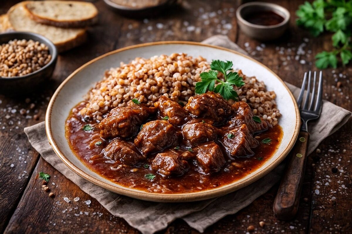 Такой ужин способен сделать вечер по-настоящему комфортным: горячая гречка, густая подлива и нежная говядина, которую легко жевать. Просто ложка за ложкой — и вспомните о том, как это было вкусно.