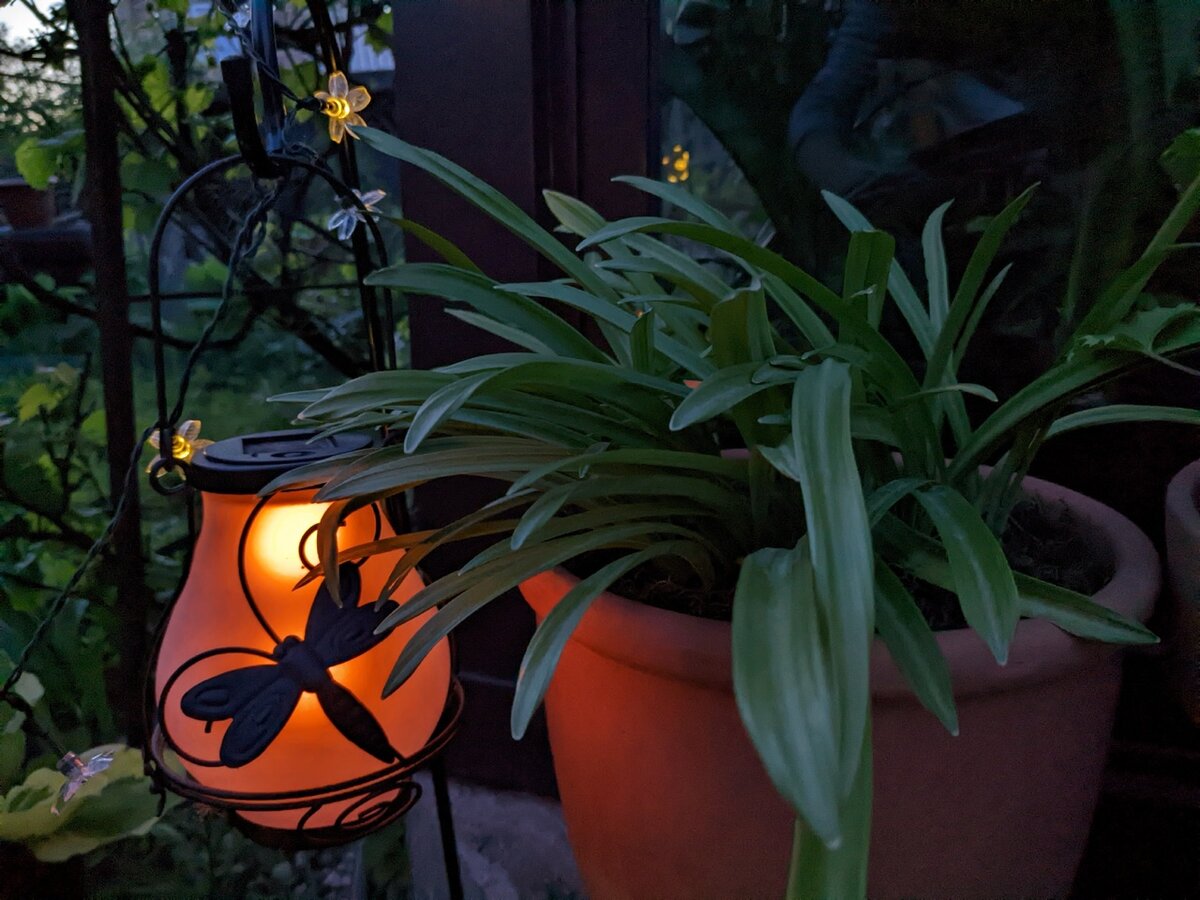 В июне сад наполнился яркими бархатцами, а фонари начали подсвечивать колеусы и канны. Сумеречный свет создает необычную атмосферу, превращая обычные вечера в настоящую сказку.