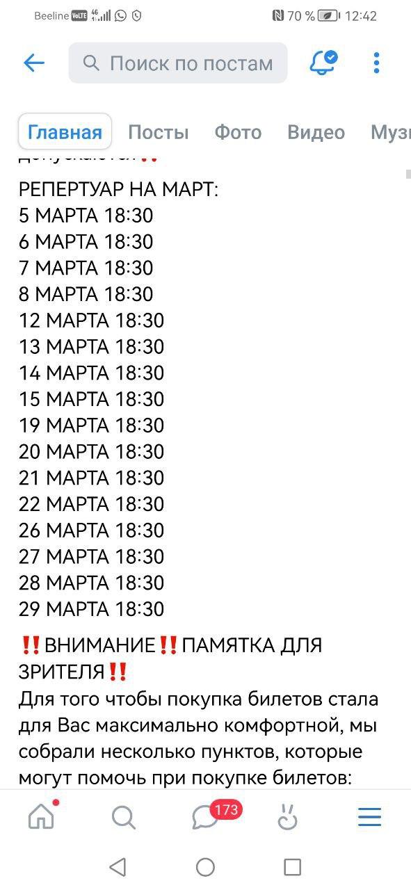 — Вчера в 12:00 должна была открыться продажа на премьерный спектакль, который будет идти в течение всего марта. В 12:15 билетов уже не было ни на один день. Люди в комментариях писали, что в 11:57 их было уже 70% продано. Зато на популярном сайте бесплатных объявлений у перекупов их навалом, — пишет в наш чат-бот подписчица.