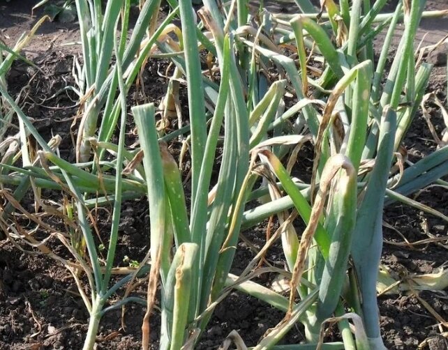 Первый признак появления вредителя — пожелтение и увядание перьев лука. На этом этапе важно быстро реагировать.