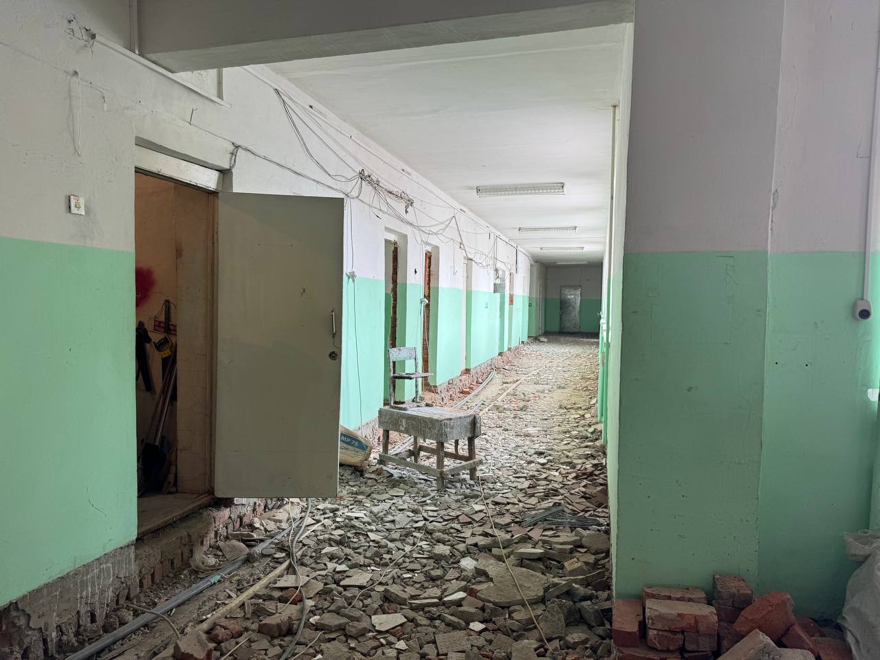 Основной проблемой в школе была протекающая крыша и фундамент — сквозь пол в подвале просачивались грунтовые воды. Ремонтные работы идут. Позже сюда также закупят мебель, кухонное оборудование в столовую. Рассчитывают закончить точно в срок.