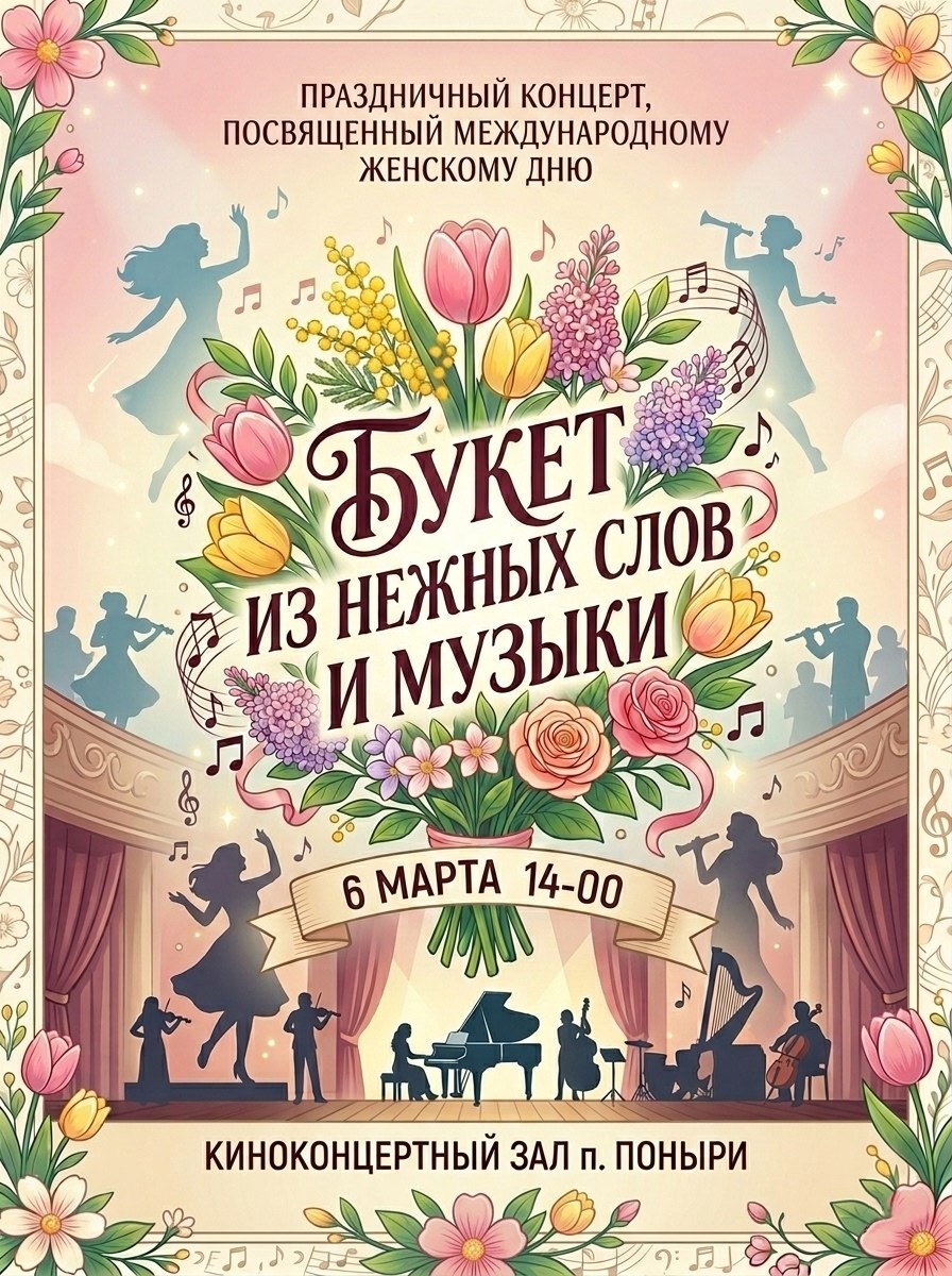 С приходом весны коллектив центра культуры и досуга подготовил особое мероприятие- встречу под названием «Букет из нежных слов и музыки», которая состоится 6 марта в 14:00 в Киноконцертном зале посёлка Поныри.