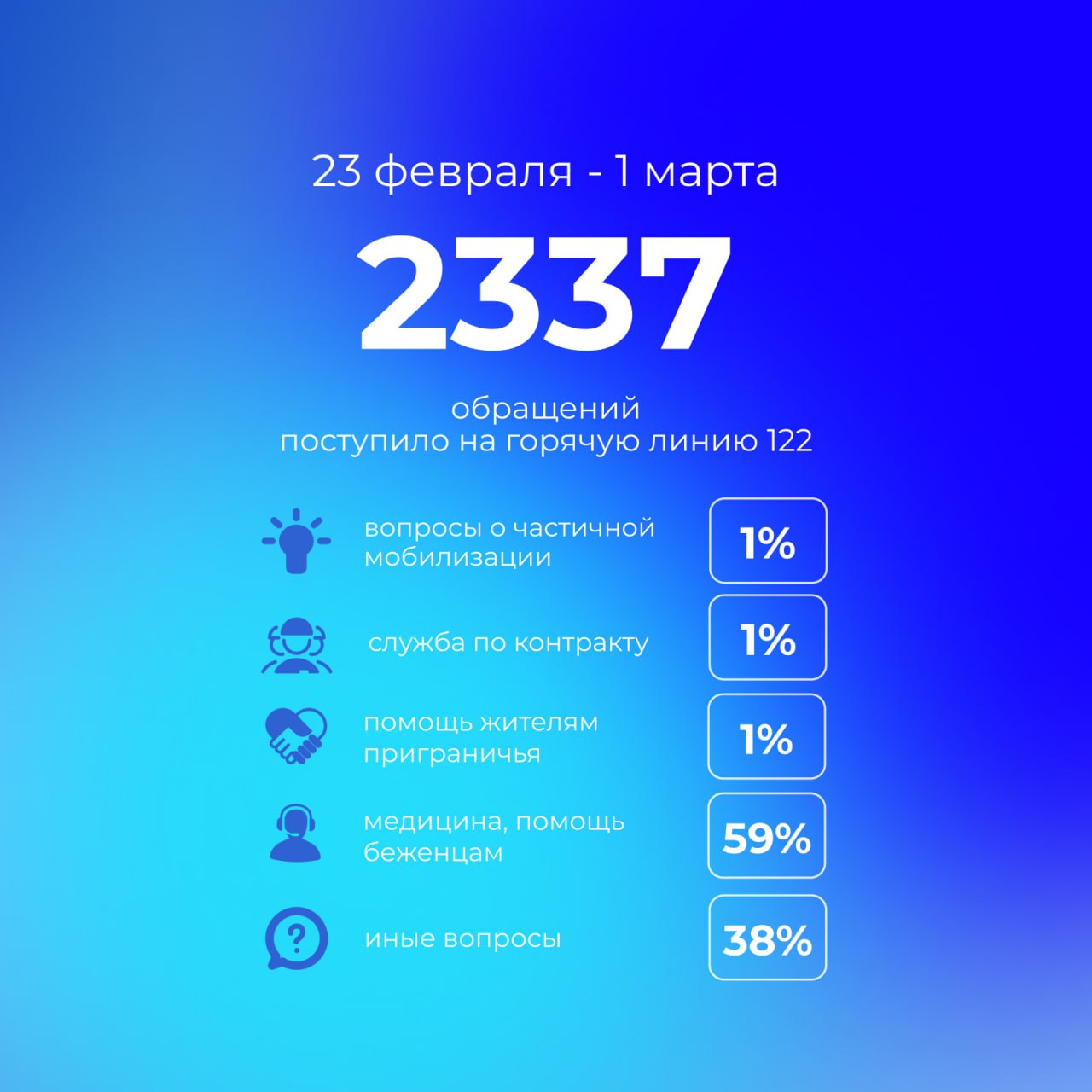 Всего за прошедшую неделю на «горячую линию» 122 поступило 2337 обращений