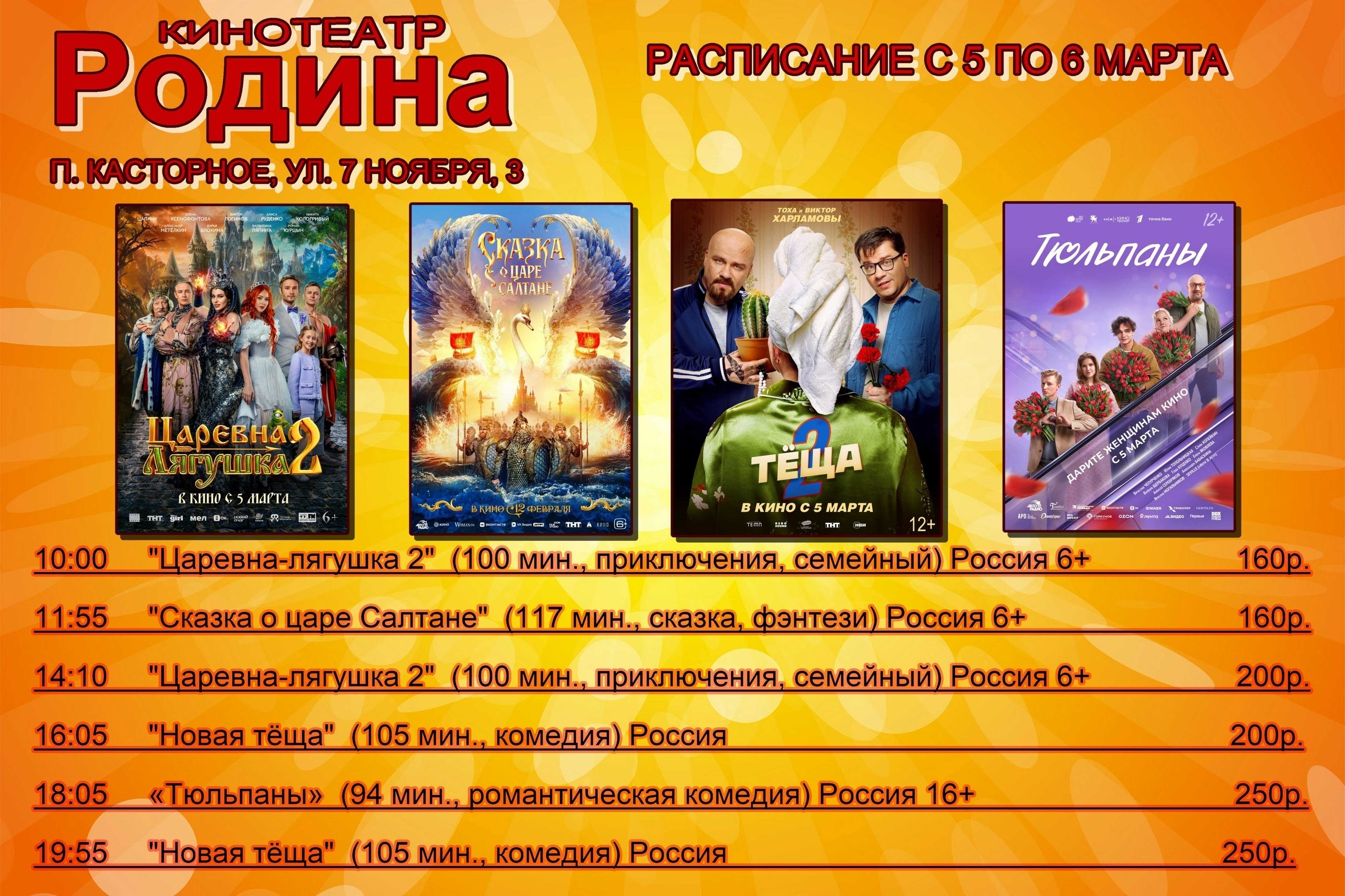 Рады представить вам расписание сеансов в кинотеатре "Родина" на период с 5 по 9 марта.