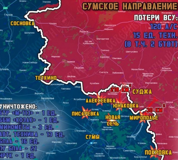 На Теткинском и Глушковском участках фронта существенных изменений не зафиксировано. Наши артиллеристы и операторы БПЛА наносили удары по вскрытым объектам ВСУ.