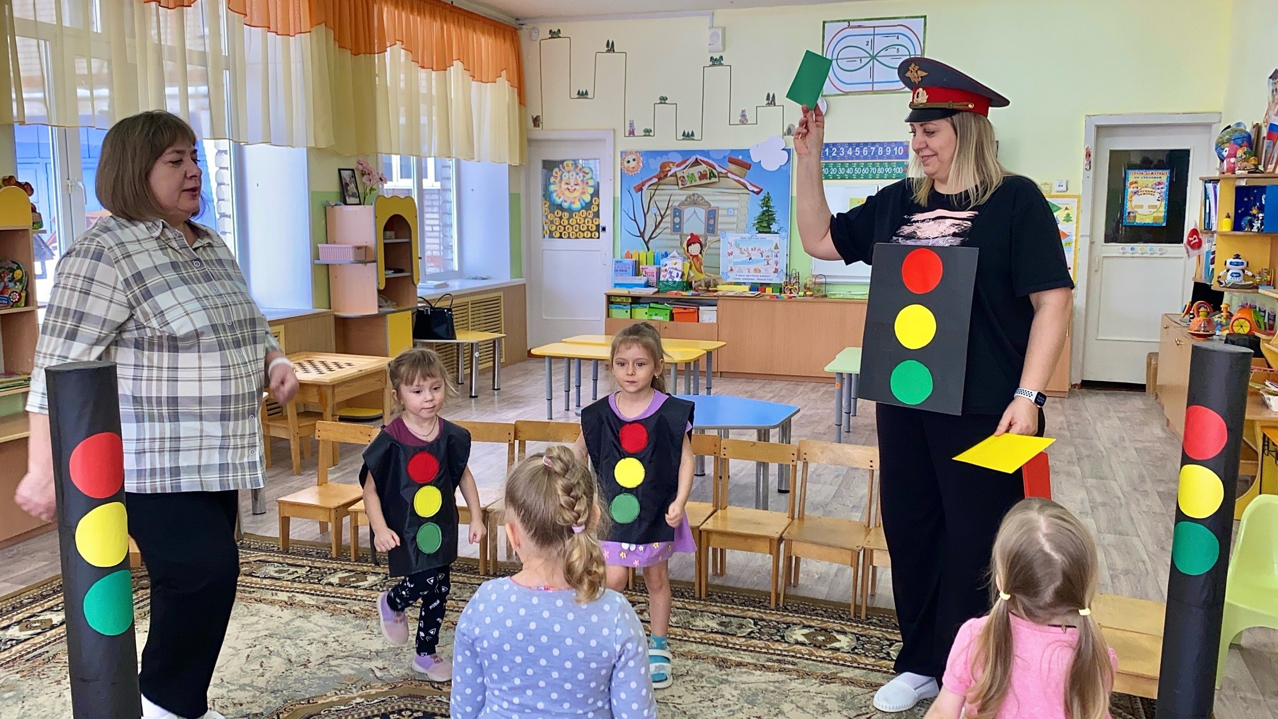 Вместе с воспитателями и сотрудниками ГИБДД ребята весело повторяли значение сигналов светофора, разгадывали загадки и даже собрали настоящий макет светофора своими руками.