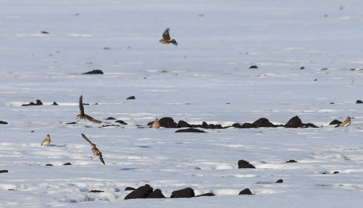 Около двух десятков птиц облюбовали обочину дороги. Вспугнутые проезжающими машинами, жаворонки перелетали и рассаживались на оттаявших комьях чернозема на соседнем поле.