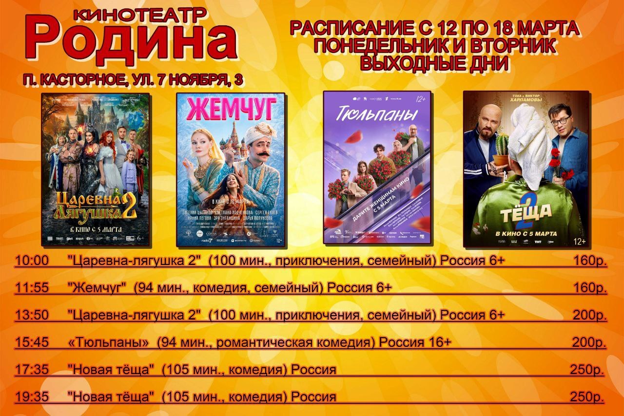 Представляем вашему вниманию расписание сеансов в кинотеатре «Родина» на период с 12 по 18 марта.