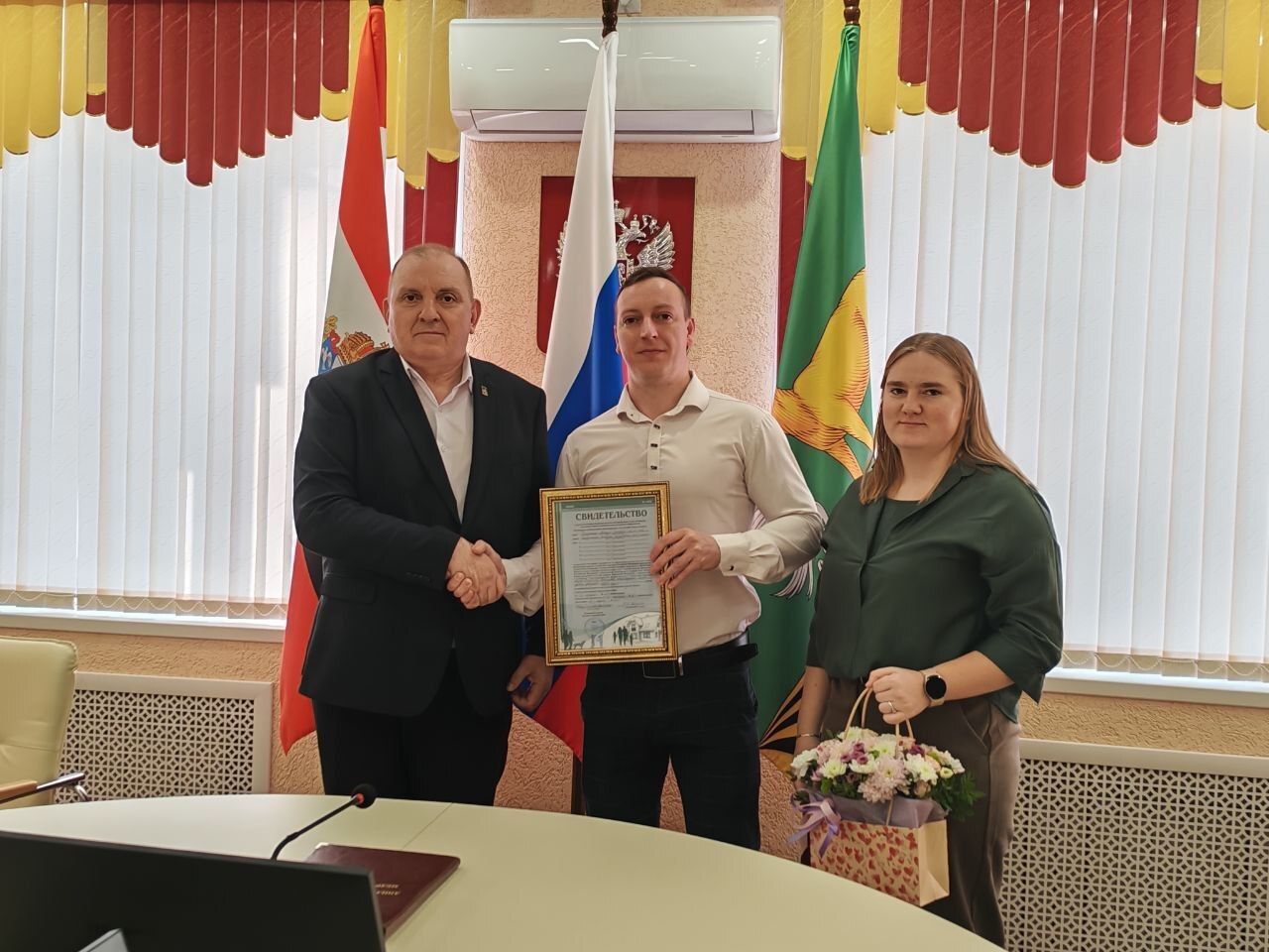 Глава Медвенского района Виктор Катунин вручил свидетельство на получение социальной выплаты на приобретение жилого помещения молодой семье педагогов Рощупкиных Михаилу и Татьяне.