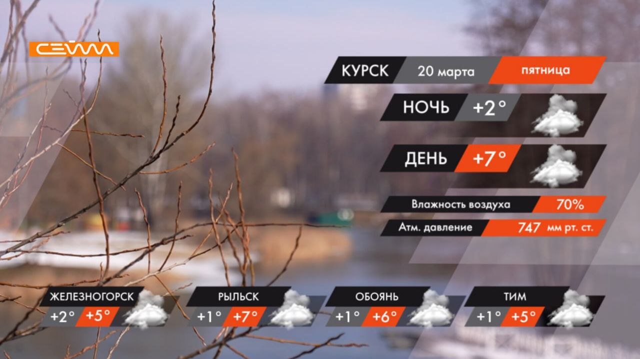 Завтра, 20 марта, в Курске будет облачно с прояснениями. Местами небольшие осадки в виде дождя и мокрого снега, туман.