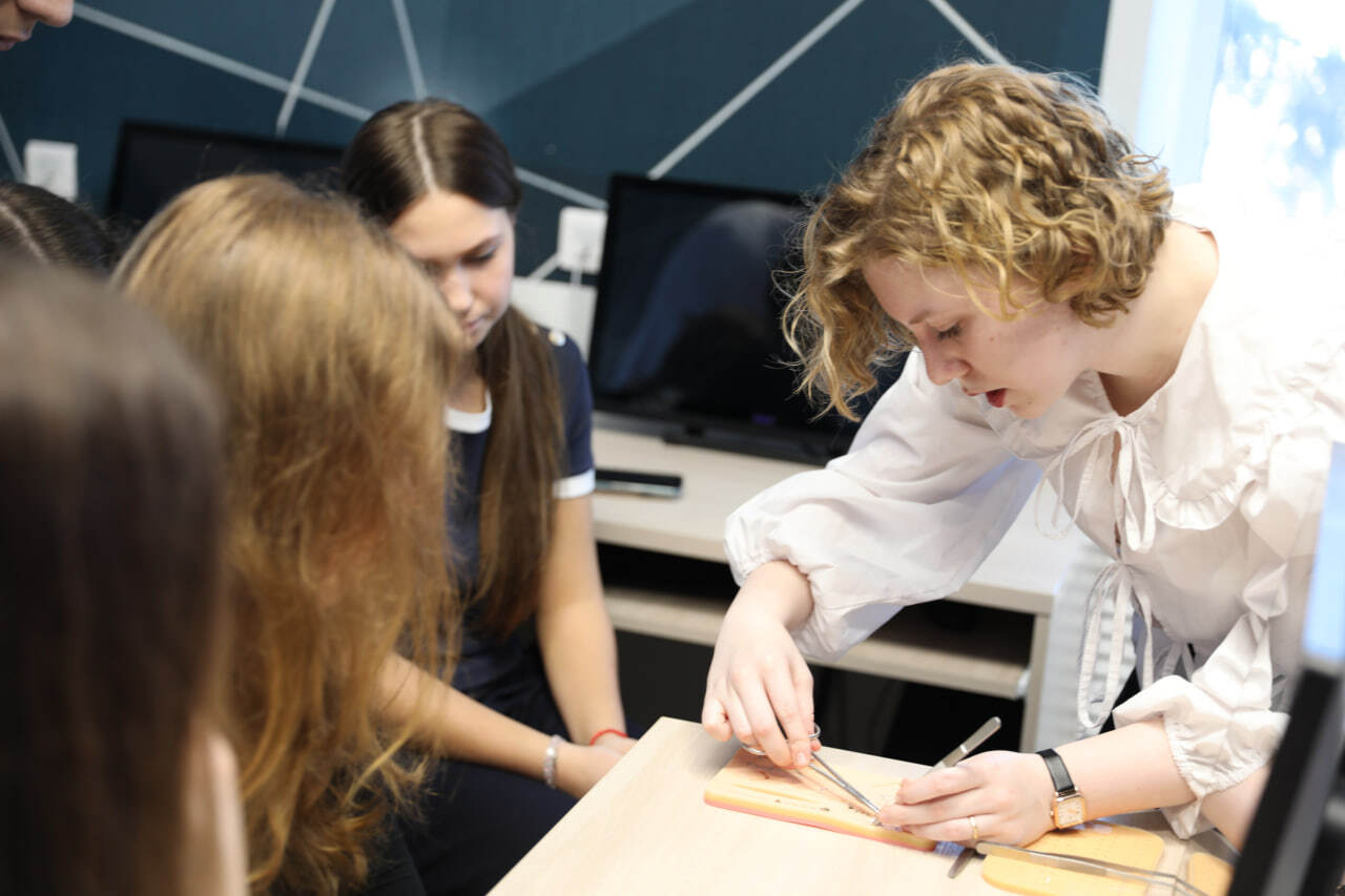 На занятиях ребята изучают теоретические основы анатомии и асептики, знакомятся с базовыми понятиями хирургии и медицинскими инструментами, а затем применяют знания на практике. Они учатся работать с простейшими медицинскими инструментами под контролем педагога, отрабатывать базовые хирургические навыки на тренажерах и моделях и многое другое.
