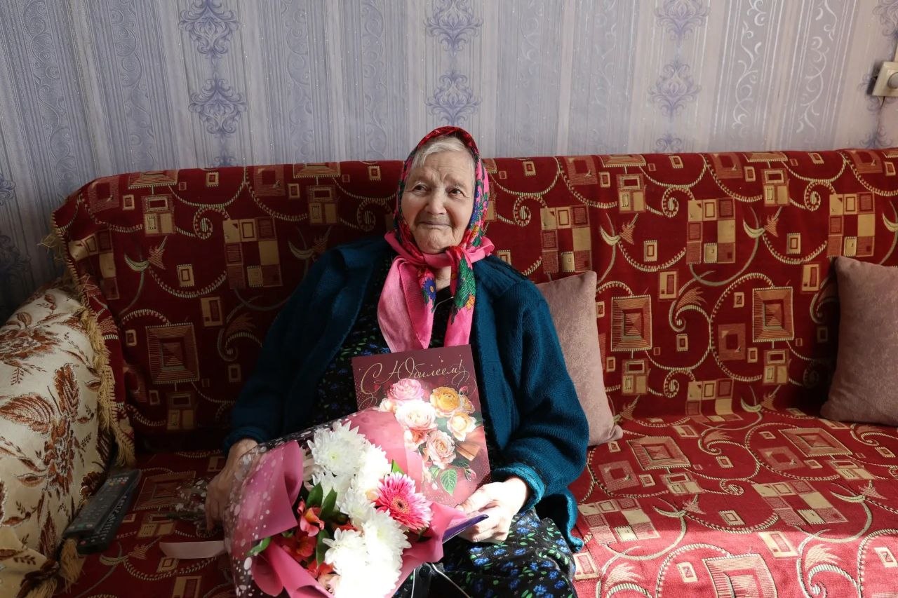 С пожеланиями долгих лет жизни и крепкого здоровья вручили ей поздравительный адрес, цветы и подарки.