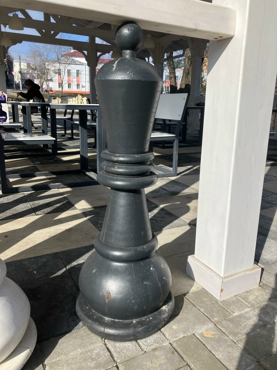 — Как красиво все начиналось! Даже зимой в морозы и под снегом шахматная беседка ждала игроков. С августа по март сохранились все 8 комплектов шахмат, только пару раз пропадали фигуры – и компенсировались курским отделением ФШР. А вот самой беседке повезло не очень, и коням, ее охраняющим. Скоро белый станет далматинцем, а потом и совсем долиняет до черного. Года еще не прошло. Может быть, подрядчик еще все исправит по гарантии?