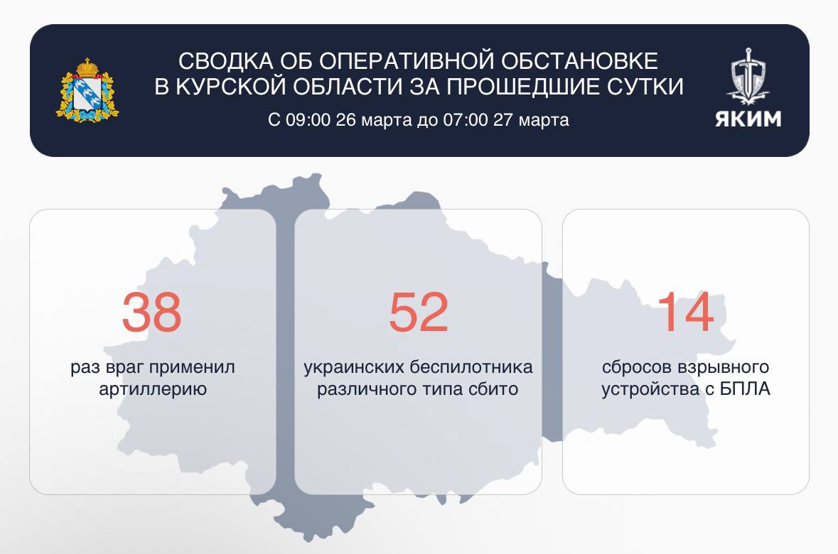 Над Курской областью за сутки сбили 52 украинских БПЛА. Зафиксировано 14 атак дронов со взрывчаткой. Кроме того, 38 раз противник бил из артиллерии по отселенным территориям.