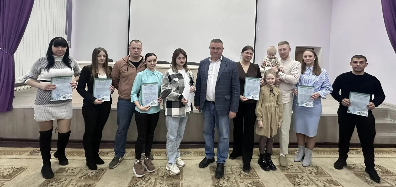 Олег Анатольевич тепло поздравил счастливых обладателей свидетельств, пожелав им счастья, здоровья и всех благ. Он выразил надежду, что их семьи будут крепкими и дружными, будут расти год от года, а в стенах их родного дома всегда будет звенеть детский смех.