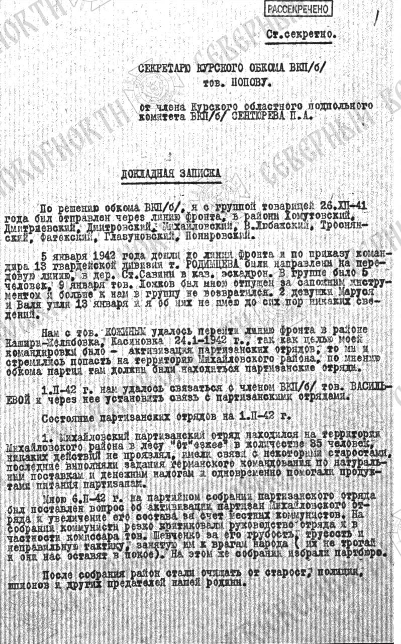 Тг-канал «Северный Ветер» совместно с работниками госархива опубликовал уникальные документы о партизанском движении в Курской области в 1942 году.