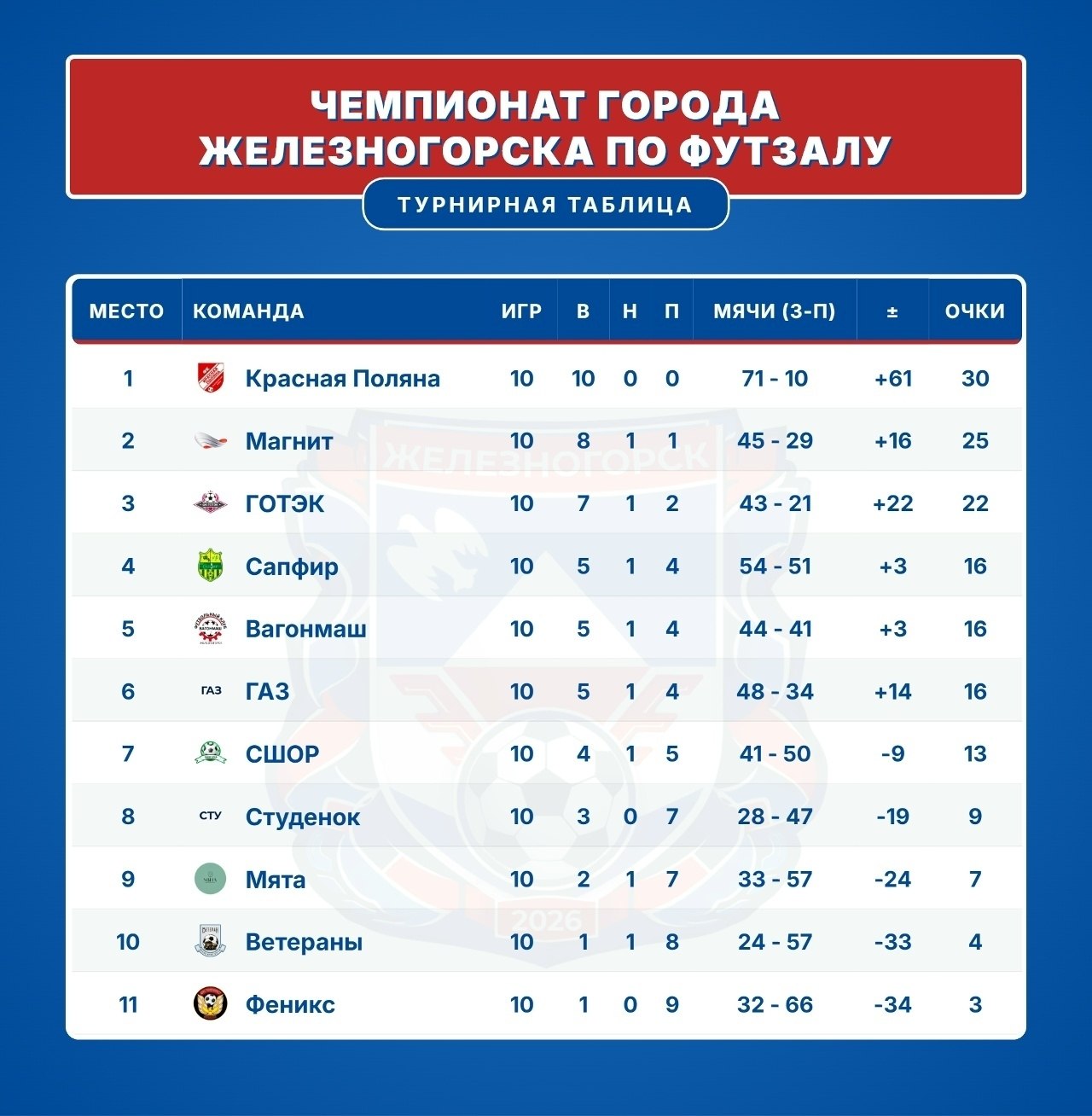 С 19 января по 29 марта 2026 года на спортивных площадках города кипели нешуточные страсти — 11 команд боролись за звание сильнейшей футзальной команды города Железногорска.